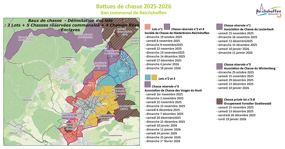 La forêt communale de Reichshoffen est divisée en 6 lots de chasse, comme indiqué sur le plan ci-dessous.