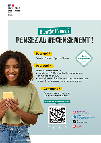 Vous venez d’avoir 16 ans et êtes de nationalité française ? Présentez-vous dans les trois mois suivant votre anniversaire à la mairie (bureau n°2), muni d’une pièce d’identité et du livret de famille des parents, pour vous faire recenser.
