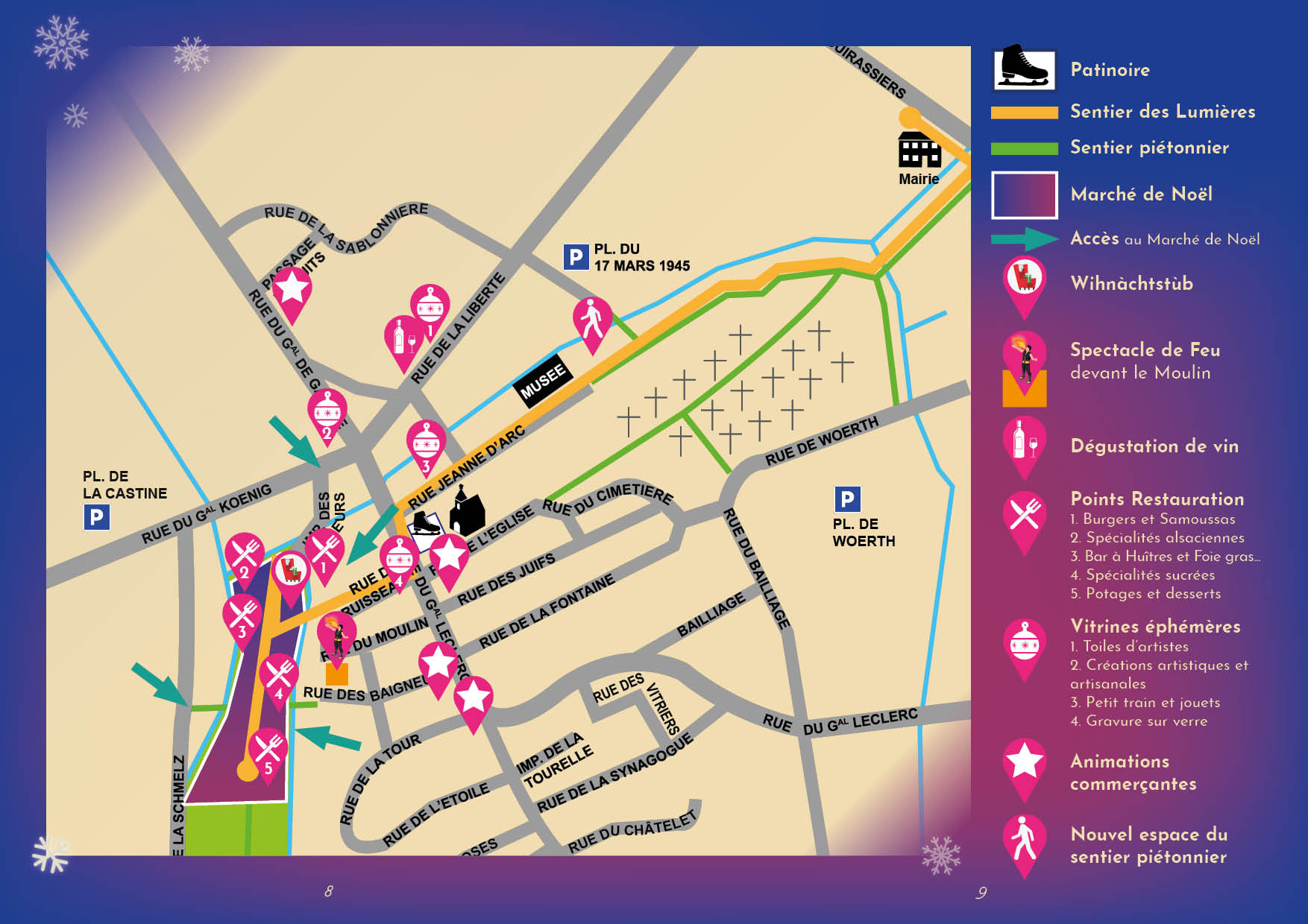 sur le Marché : Bar à huitres et foie gras, Pain d’épices, Effiloché de bœuf aux pruneaux et abricots secs, Burger alsacien, Samoussas, Potages, Gaufres, Bredele, Dampnudle, Vin chaud*, Chocolat chaud...