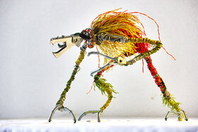 Influencé par la science-fiction, Adrien Vinet crée à partir de métal, de plastiques et d’autres matériaux de récupération, des silhouettes intrigantes, postapocalyptiques, presque cauchemardesques qui témoignent de notre mode de vie à la consommation effrénée.